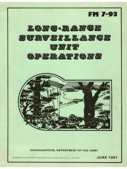 The initial cadre of NCOs and I found ourselves assigned to a new unit where there was no current doctrine. After the publication of AirLand Battle doctrine in the 1984 version of FM 100-5, the Army determined that division commanders needed a dedicated ground long range reconnaissance and surveillance capability. At the time our unit stood up, the Infantry School was still working on the draft field manual (the first version of FM 7-93 Long Range Surveillance Unit (LRSU) Operations was not published until June of 1987). Other than the Ranger Handbook (then numbered ST 21-75-2), the only existing doctrinal reference was the Vietnam-era FM 31-18 Long-Range Reconnaissance Patrol Company dated August 1968.