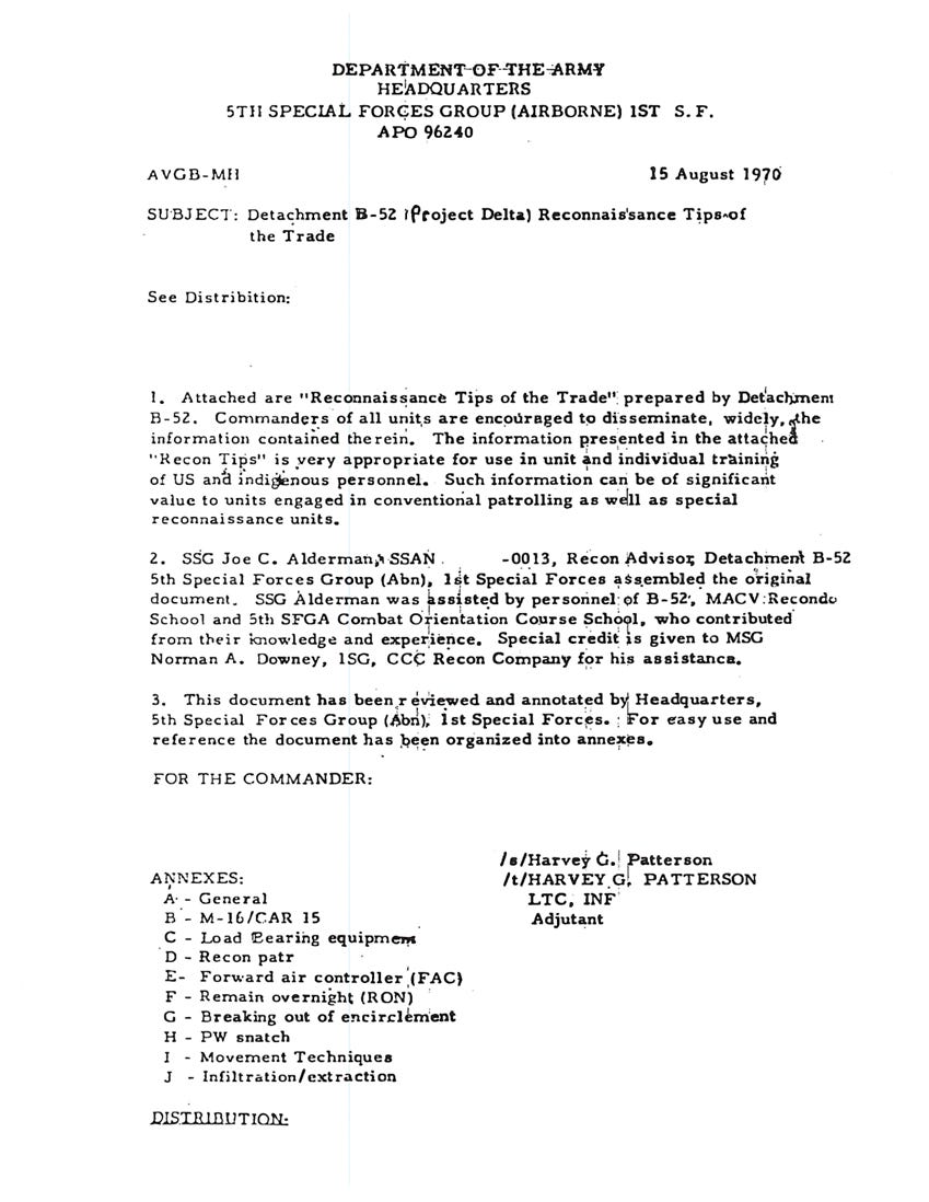 One of the great documents that we received from the SR Course cadre was the Detachment B-52 (Project Delta) Reconnaissance Tips of the Trade published by 5th Special Forces Group (5th SFG) HQ in Vietnam on 15 August 1970. This is the cover page: