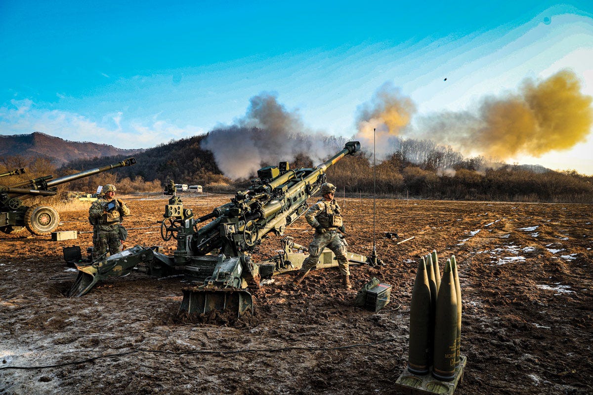 An artilleryman assigned to 2nd Battalion, 17th Field Artillery Regiment, 2nd Stryker Brigade Combat Team, 2nd Infantry Division, fires an M777 howitzer during an artillery training exercise on 12 January 2023 in South Korea during Korea Rotational Force 12.